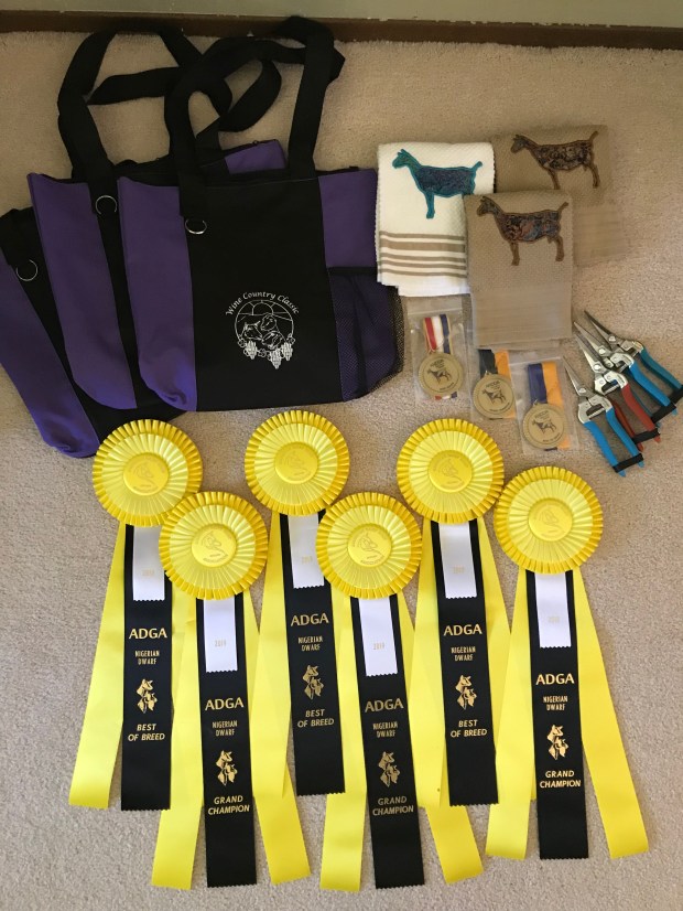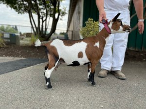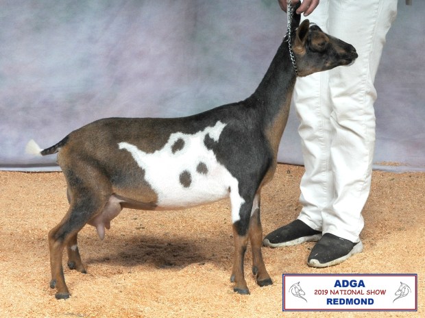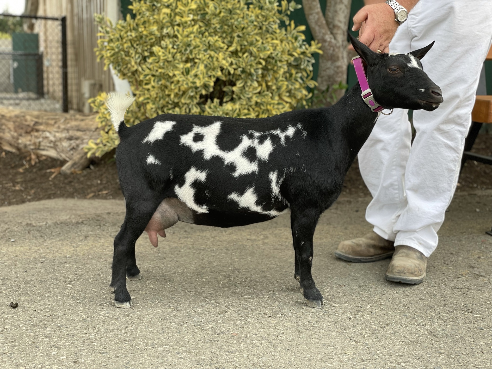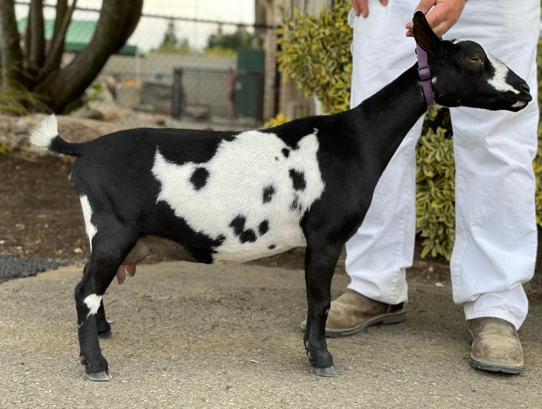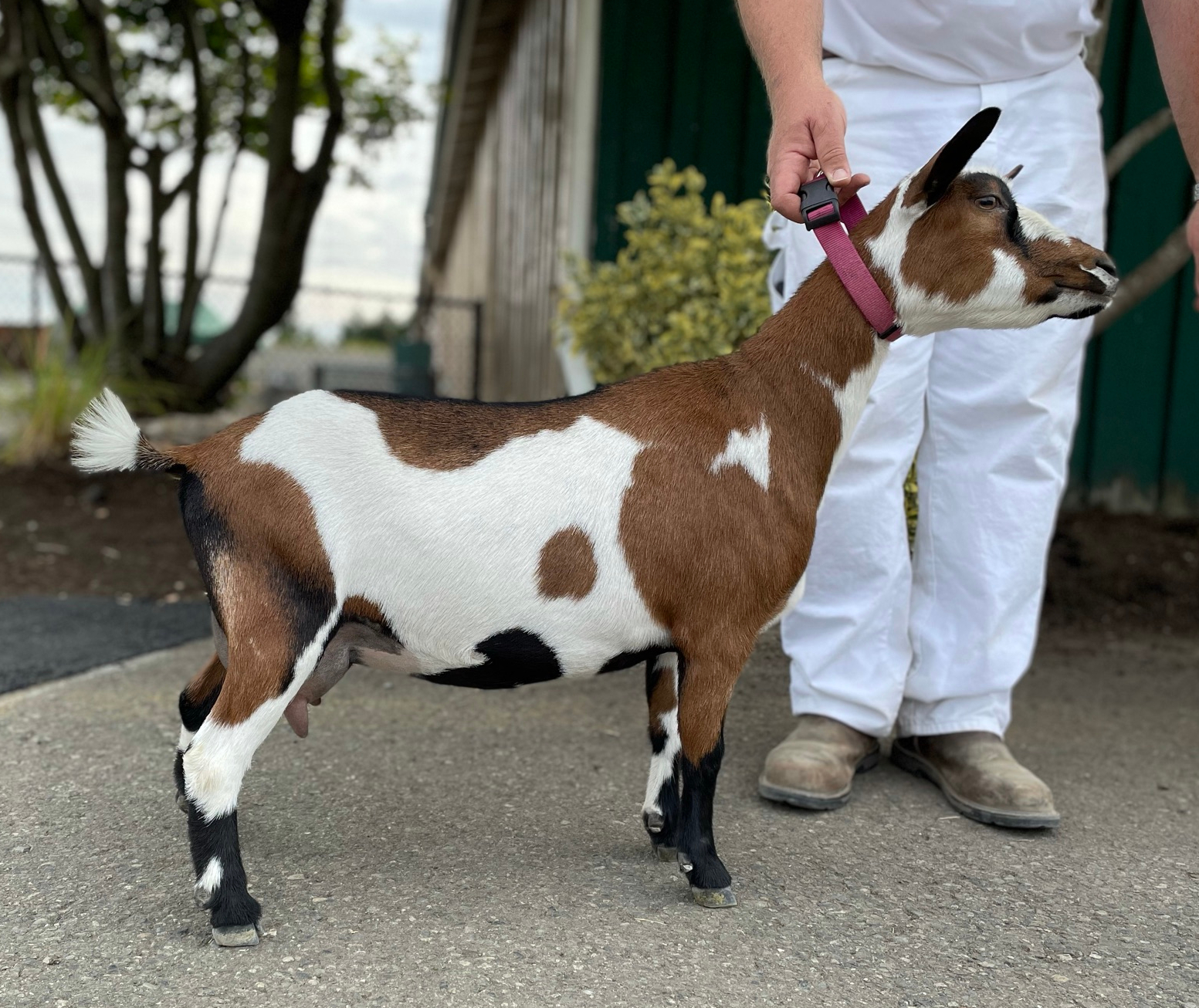 Truffles is our foundation doe and matriarch of our herd. Our son purchased her from a senior 4H’r that was aging out with money he earned from selling eggs as a showmanship goat. After not settling the first year on the farm due to mineral deficiencies we got her bred in 2017. In 2018 she finally got into some open class shows and was showing some promise. In the final show of the season (Evergreen State Fair) she took GCH, Best in Show and Best Udder in a very competitive class. She also earned her AR star in 2018 making her a 2*M (2nd generation) milker. The following year 2019 she kidded with quad does and we entered her in several shows. She did well just missing the final cut. Then in June of 2019 at the Wine Country Dairy Goat Show she won all 3 rings, Best in Show and Best Udder overall! This made her a finished GCH. In the fall of 2018, she received her SG status as well. We retained 1 of her 2019 daughters, Cowgirl.