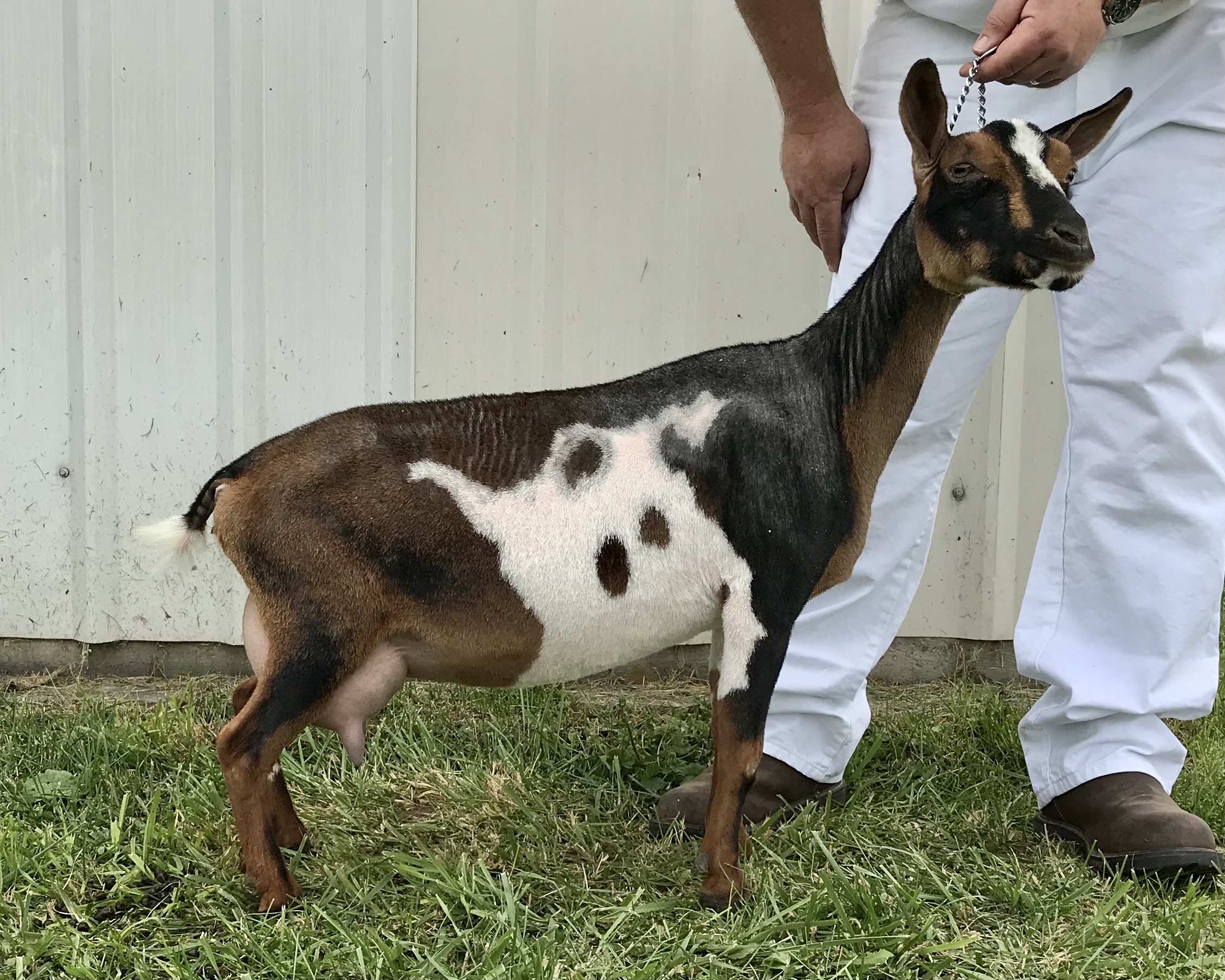 Jersey is the daughter of Moo Moo and Art. Our Son picked her as his next showmanship goat. She kidded with a single buck in 2021.