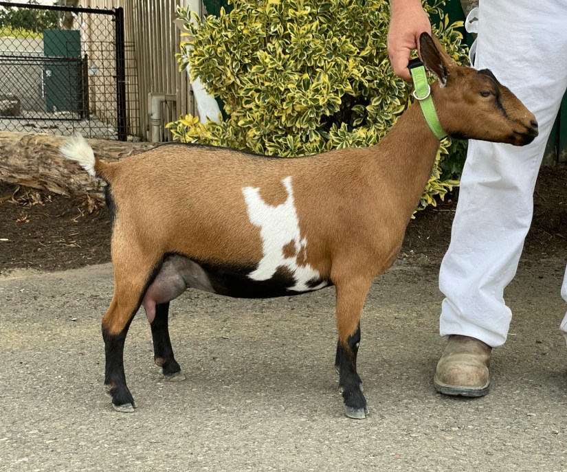 Bay is a daughter of Maggie and is from the 2020 kid crop. She has a long level topline, strong brisket extension, wide rump and is a very dairy doe. She kidded with 2 doelings (2021) and 1B/1D in 2022.