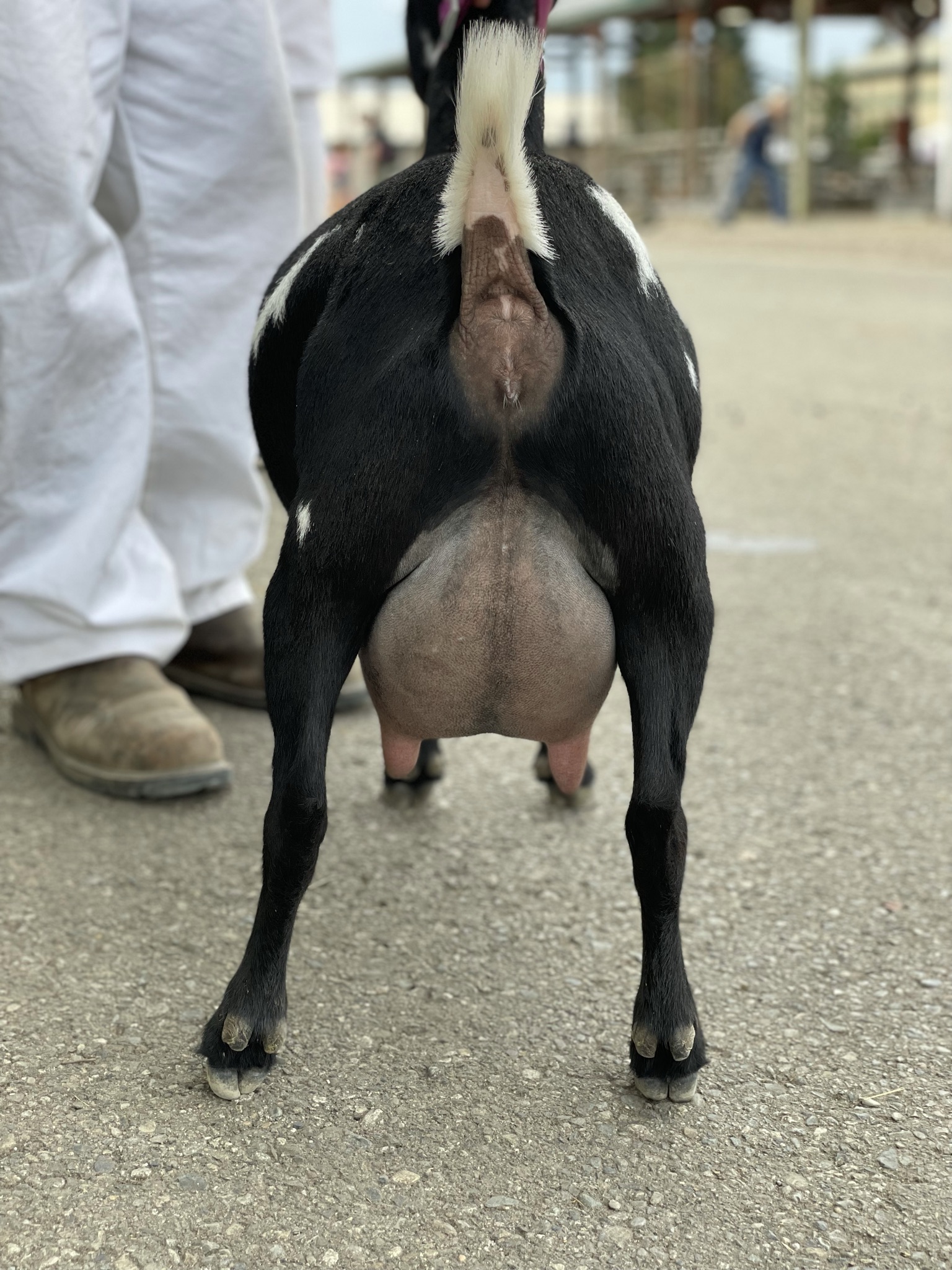 Marabou Aka Cowgirl (named by our youngest) is a full sister to Moo Moo but “a pain in the pail”. She can be a little impatient and LOUD waiting for her turn to get on the stanchion. As an FF she kidded with a single buckling a little above average in size. We almost lost her as he was coming out head backwards. After 20 minutes, we phoned a good friend Sam from Highland Ranch Dairy Goats to assist and she was close by thankfully. As I held her, Sam attempted to get that head out for nearly an hour, it just wasn’t working. Sam was was at the point she suggest we call the vet still trying when all the sudden there was a pop, she got it. The head came forward and out he came! Lifeless at first, I worked on him for what seemed like forever, a little limp noodle and not breathing well at all. After a lot of stimulation, he came to life. We were very grateful Sam was there and stuck with it, she told me right when she was telling Leslie we probably should call the vet she said a prayer and asked God “let this baby come out” and out he came. As you can tell cowgirl is special to us. She earned her ST star as an FF and is a 3*M, we will put her back on test to earn her AR star as a 2F. As a second freshener she kidded with 2 bucklings and one doeling. We have retained one of the bucklings as a junior sire to our herd. We are looking forward to seeing the beautiful udders his mamma has replicated in our herd next year.
